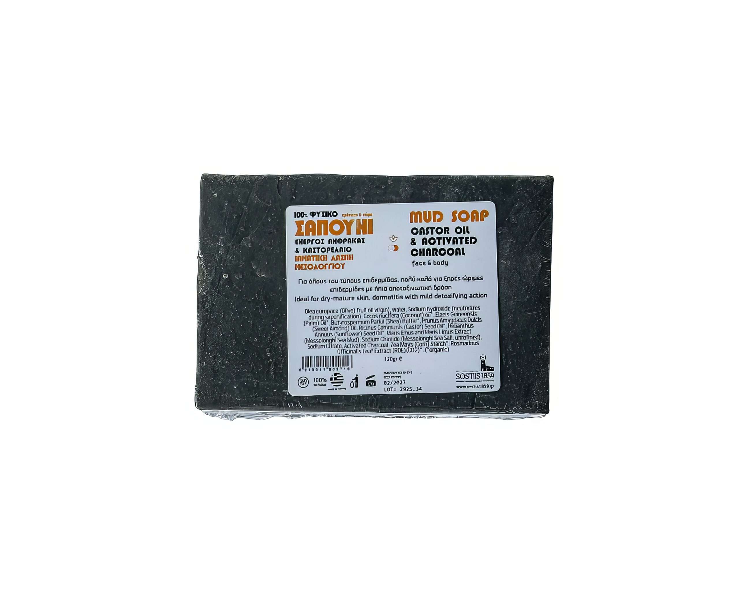 ΣΥΣΤΑΤΙΚΑ: Παρθένο Ελαιόλαδο, Έλαιο Καρύδας*, νερό, καυστική σόδα (εξουδετερώνεται κατά την σαπωνοποίηση), Φοινικέλαιο*, Βούτυρο Καριτέ*, Αμυγδαλέλαιο, Καστορέλαιο*, Ηλιέλαιο*, Ιαματική Λάσπη και Εκχύλισμα Ιαματικής Λάσπης (Λιμνοθάλασσας Μεσολογγίου), Θαλασσινό Αλάτι Μεσολογγίου (ανεπεξέργαστο), Κιτρικό Νάτριο, Ενεργός Άνθρακας, Άμυλο Αραβοσίτου*, Εκχύλισμα Φύλλων Δενδρολίβανου (CO2)*. (*βιολογικής καλλιέργειας)