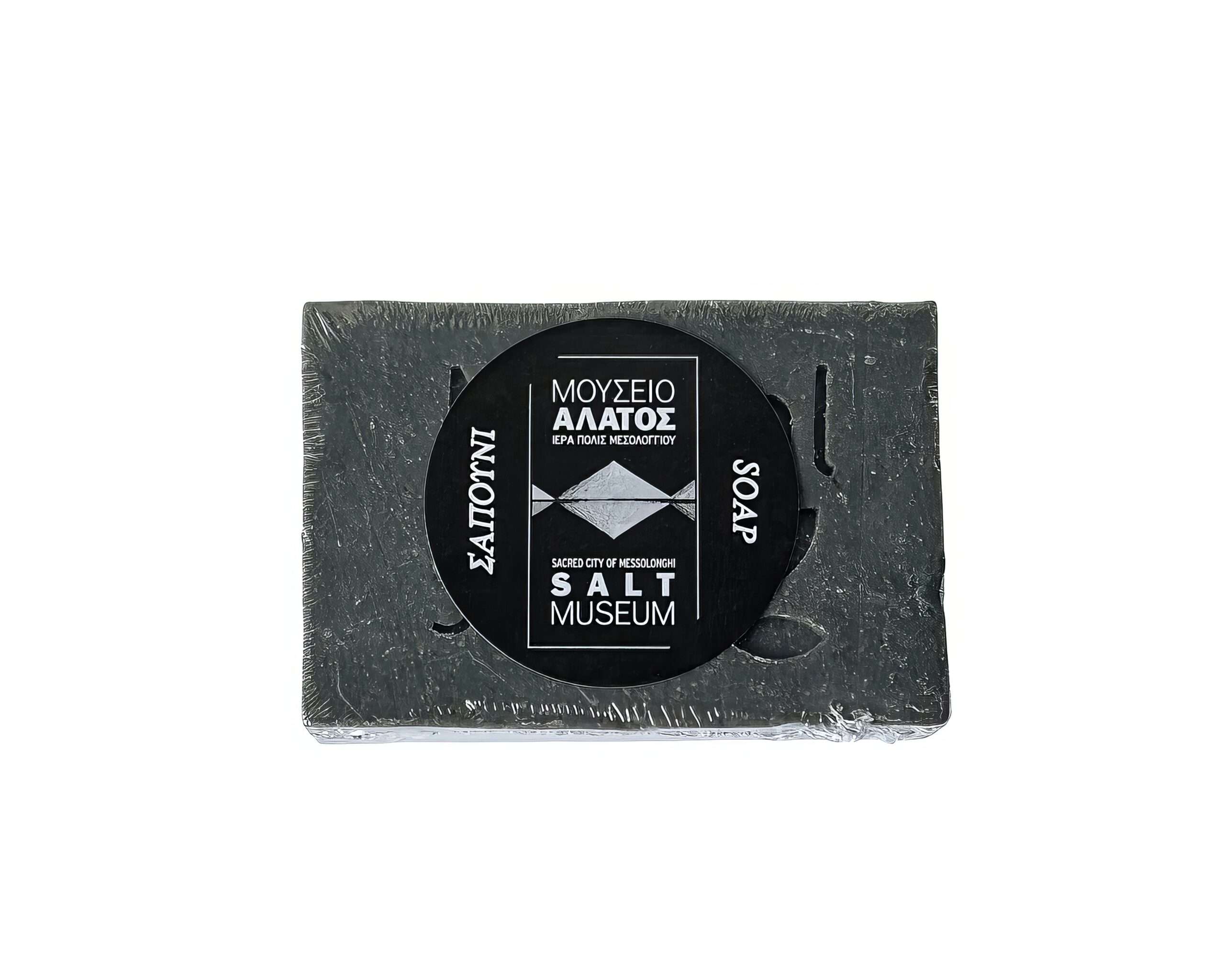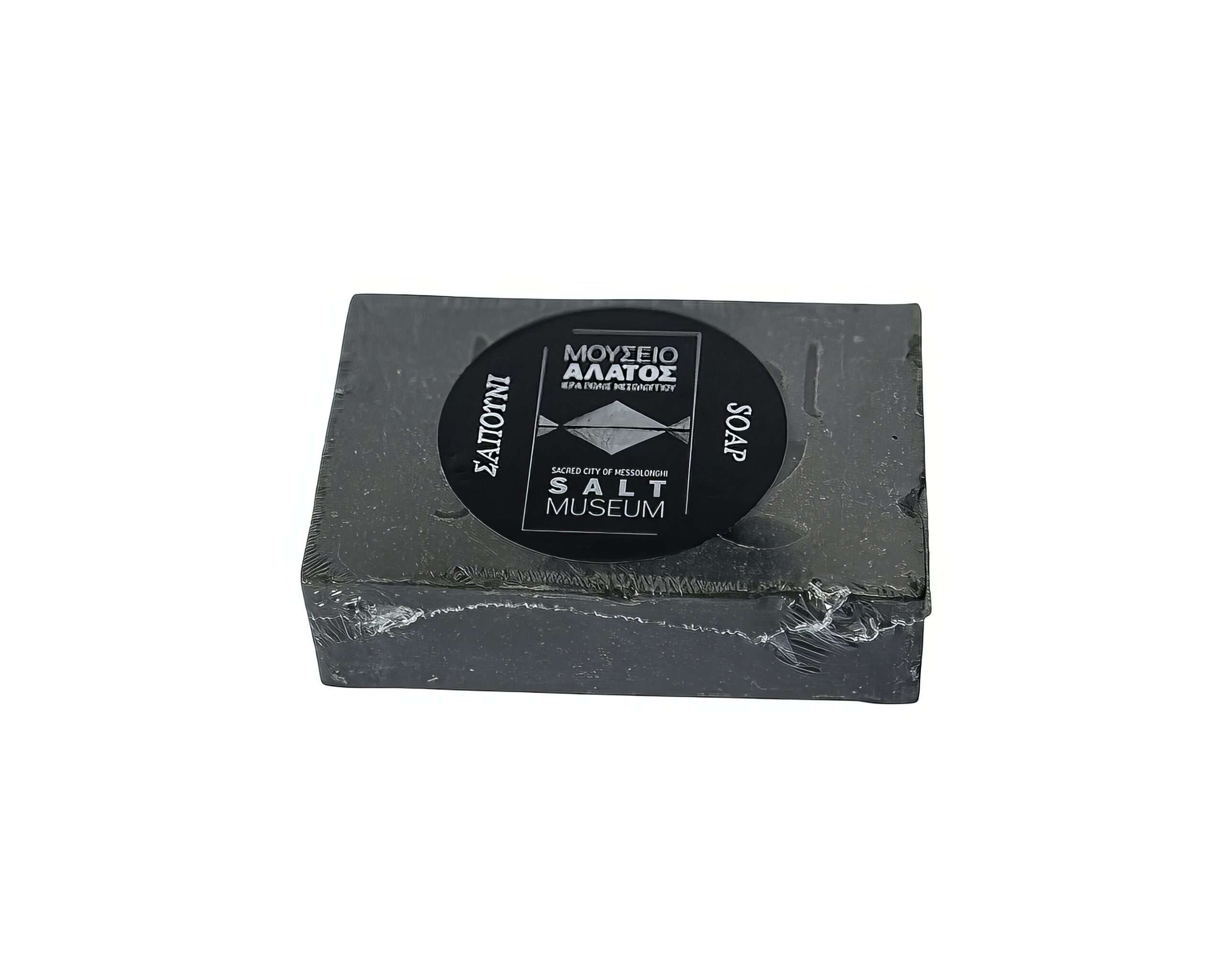 Σαπούνι με θαλασσινό αλάτι Μεσολογγίου, ιαματική λάσπη Μεσολογγίου, αμυγδαλέλαιο και ενεργό άνθρακα.